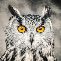 De ogen van een uil zijn zó mooi sprekend, die horen gewoon op te vallen. Vandaar de keuze om ze hier in kleur te laten, en de rest wat neutraler te maken.