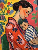 Een levendig, op Fauvist geïnspireerd portret van een moeder die haar slapende kind wiegt. Felle kleuren en expressieve penseelstreken geven de warmte, tederheid en tijdloze band tussen ouder en kind weer.