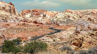 De foto toont een kronkelende weg die door een indrukwekkend woestijnlandschap van de Valley of Fire in Nevada slingert. De rotsformaties in verschillende aardetinten, variërend van diep oranje tot zacht beige, vormen een fascinerend contrast met het donkere asfalt. De grootsheid van het landschap en de eenzaamheid van de weg roepen een…