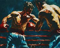 In het levendige schilderij domineren twee boksers het canvas, verwikkeld in een opwindend gevecht halverwege de wedstrijd. Het moment van de impact is perfect vastgelegd, waarbij de handschoen van de ene bokser net de kaak van zijn tegenstander raakt, waardoor het zweet in een dramatische boog in het rond vliegt. De uitdrukkingen van…