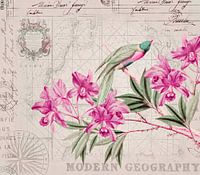 Nostalgische illustratie van een parkiet in een tropisch regenwoud op een tak met bloemen, pasteltinten en elementen van oude kaarten ronden het motief af tot een koloniaal beeld.