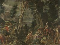 De ontmoeting van David en Abigail. David komt, vergezeld van zijn soldaten, te paard uit een bos gereden. Abigail, die gevolgd wordt door een stoet van dienaars met geschenken, knielt voor hem op de grond.
