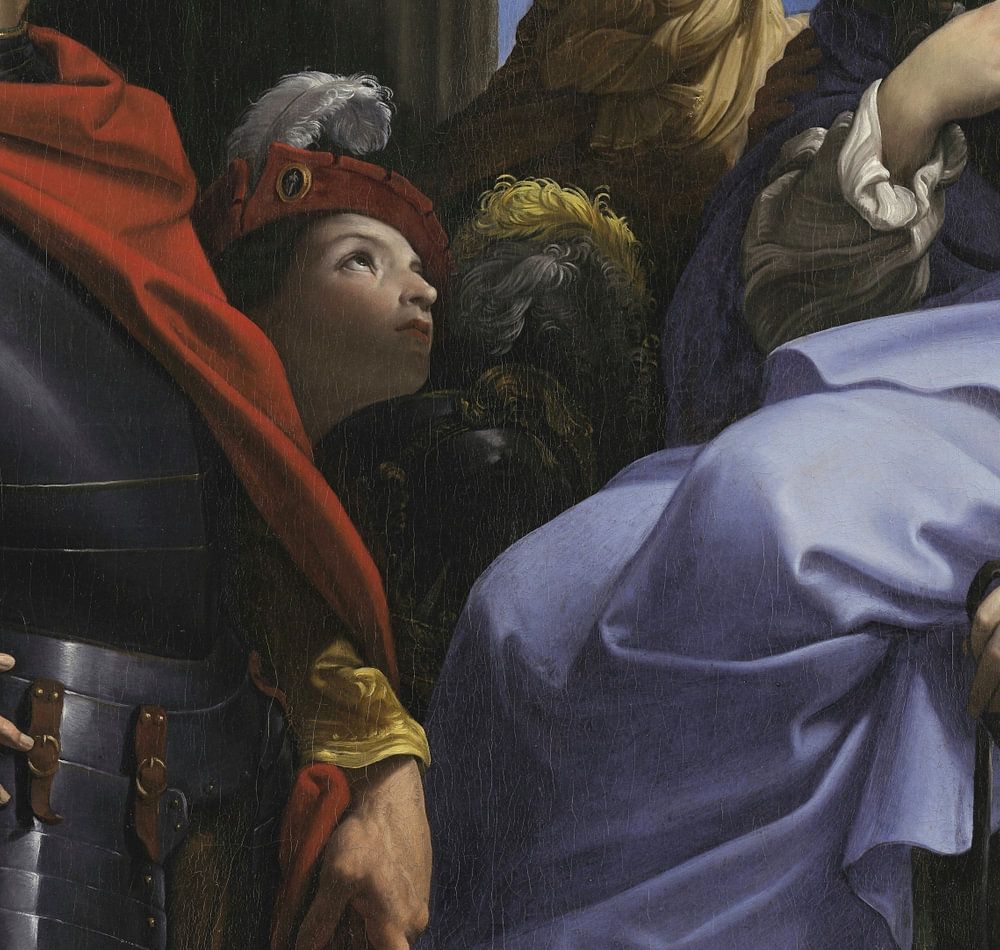 In deze scène uit het Oude Testament bezoekt Abigail het kamp van David om zich te verontschuldigen voor haar man die David en zijn soldaten had beledigd. Bleek en gebogen, met haar ogen neergeslagen, is Abigaïl duidelijk berouwvol. Zelfs haar ezel laat zich verontschuldigend zakken. David staat trots in zijn glanzende harnas en rode vloeiende cape, maar zijn gezicht suggereert tederheid - misschien verwijzend naar het einde van het verhaal wanneer David en Abigail trouwen na de dood van haar slechte echtgenoot.