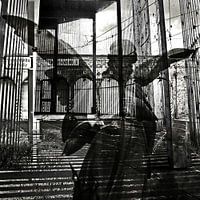 Deze artistieke, stedelijke gevel met de figuur van een aankomende engel is een abstracte fotocollage met een mystieke uitstraling en fantasierijke sfeer.