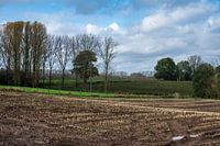 De maïs oogst is binnen. De bruine kleur van de aarde contrasteert mooi met de overgebleven gouden stoppels en het groen.