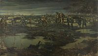 In dit schilderij zien we de oorlog op zijn woedenst met vurende kanonnen, terugtrekkende en elkaar ondersteunende soldaten met wapens en slachtoffers op de grond, doden in de modder en tussen de plassen. Verder zien we brandende, kapotgeschoten huizen en bomen en één soldaat op een brancard. Het is een triest schouwspel uit de eerste wereldoorlog, 1914, 1918.