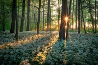Op de voorgrond bloeit een tapijt aan daslook (wilde knoflook)