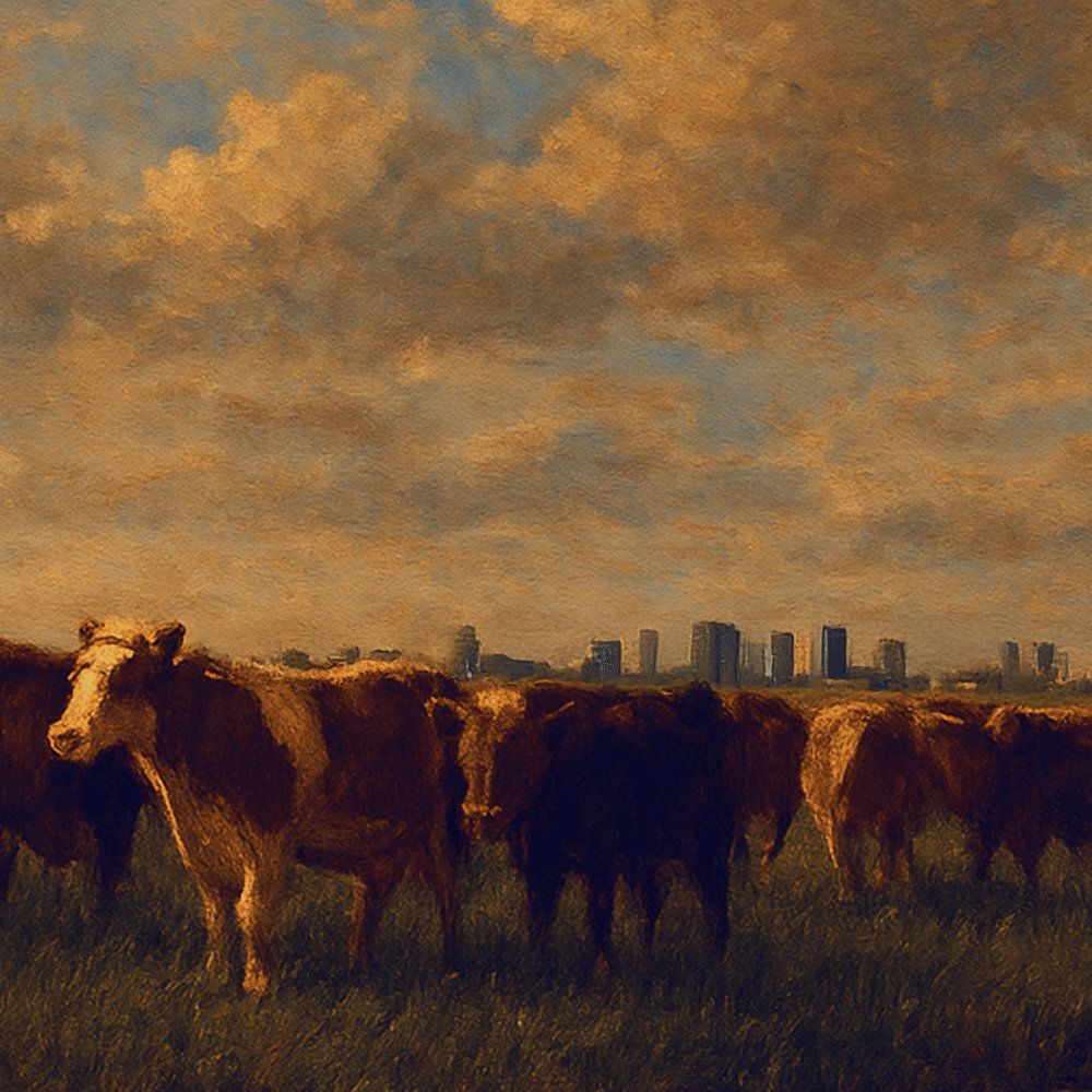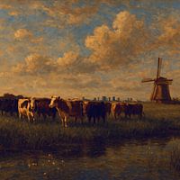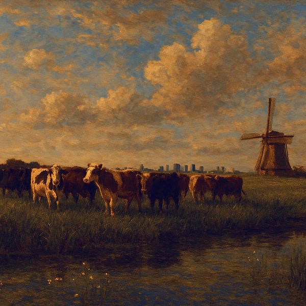 Land onder zeeniveau. Polders, sloten en vaarten. Een kudde koeien, een traditionele windmolen en een oprukkende stad maken dit Romantisch ogende landschap heel eigentijds. Waar hier de rust is, verraadt de skyline daarachter de drukte van het moderne Amsterdam. Een groter contrast lijkt er haast niet te bestaan. Een prachtig werk…