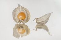 De structuur van de huls is prachtig te zien in deze foto en geeft een mooi contrast met de gladde huid van de oranje vrucht. Als je inzoomt op het werk is dit goed te zien!