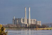 De oude IJsselcentrale in Zwolle in de tijd dat er nog twee pijpen waren. Deze centrale is nu afgebroken en er staat hooguit nog een bouwval. Leuk voor een bedrijf in Zwolle aan de muur. De IJsselcentrale licht aan de IJssel.