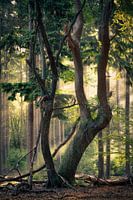 Een mooie oude boom met ruige vormen en op de achtergrond staan kaarsrechte dennenbomen die worden verlicht door zonneharpen