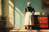 Het schilderij in de stijl van Edward Hopper toont een oude vrouw die alleen in haar keuken staat. Het warme ochtendlicht valt door het raam en werpt lange schaduwen op de vloer. Haar rug is gebogen, niet alleen van ouderdom, maar van jaren van herhaling - hetzelfde fornuis, dezelfde beweging, hetzelfde rustige begin van een nieuwe dag. Het is het soort eenzaamheid dat niet hardop schreeuwt, maar stilletjes door de routine heen sijpelt. De wereld buiten leeft door, maar hier lijkt de tijd stil te staan - bevroren tussen herinnering en gewoonte.