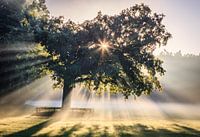 Een oude eikenboom in de mist met de zon er achter. Deze eik was eerder een hoger, maar door een blikseminslag is het bovenste stuk van de boom afgebroken.