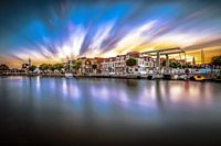 Razende wolken met prachtige kleuren van de zonsondergang. Oude gevels en grachtenpanden aan de kade van de oude haven in de Noord Hollandse Stad Alkmaar. Op de Achtergond zie je de toren van de Waag me zijn kaasmarkt.