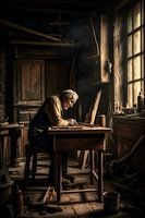 Koop dit digital art kunstwerk De oude houtbewerker aan zijn werktafel bezig. van Harry Stok als reproductie geprint op canvas, aluminium dibond, (ingelijste) fotoprint, behang en ArtFrame. Voor jou op maat geprint in Fine-Art kwaliteit.