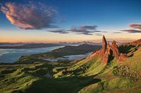 De oude man van Storr op het eiland Skye, Schotland, in de ochtend met alpenglow.