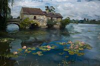 Het schilderij van een oude molen bij een rivier in de stijl van Claude Monet toont het idyllische tafereel van een schilderachtig landschap. De molen en de rivier zijn afgebeeld met levendige kleuren en zachte, vloeiende penseelstreken, typisch voor Monets impressionistische stijl. Het spel van licht en schaduw geeft het tafereel een…