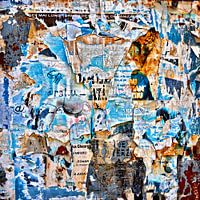 Beeld nr. 41 uit de serie "Schoonheid van verval": Resten van oude posters op een roestig metalen paneel in Sighisoara (Schässburg) in Transsylvanië, Roemenië