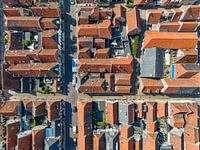 Elburg oude ommuurde stad gezien van bovenaf tijdens een mooie zomerdag in Gelderland, Nederland. Elburg was vroeger een vissersstadje, maar is nu meer gericht op toerisme vanwege de ligging nabij het Veluwemeer en de Veluwe als populaire toeristische bestemmingen.
