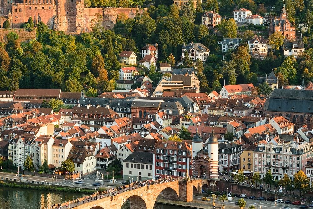 Gezicht op de oude binnenstad van Heidelberg met de Oude Brug en het kasteel van Heidelberg vanaf de Filosofenweg.