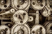 Binnenzijde van een oude gokkast met verweerde tandwielen
