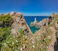 De oude vuurtoren aan de rotskust van Capo Ferro, Liscia di Vacca, Sardinia, Italië