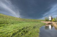 De historische vuurtoren van Workum aan de dijk bij de havenentree van het Friese IJsselmeer stadje Workum gespiegeld in de sloot achter de dijk.