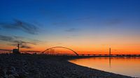 De oversteek, ook wel Stadsbrug genoemd, net na zonsondergang. De Oversteek is de neiuwste verbinding met de stad Nijmegen over de rievier de Waal. De nagloed van de net ondergegane zon zorgt voor een mooie achtergrond waartegen de brug afsteekt.