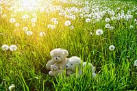Drie witte teddyberen liggen in een groene weide met veel paardenbloemen in het zonlicht.