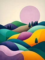 Bij het eerste gezicht wordt de toeschouwer gevangen door de harmonieuze samenstelling van tinten, die samen een landschap oproepen dat zowel herkenbaar als surrealistisch aanvoelt. De ondertonen van diepgroen en levendig blauw roepen een gevoel van rust en verbondenheid met de natuur op, terwijl de opvallende accenten van oranje en geel warmte en optimisme uitstralen. Dit kunstwerk nodigt uit tot contemplatie en laat ruimte voor eigen interpretatie, waardoor elke kijker zijn of haar eigen verhaal kan vertellen.