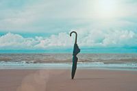 Een paraplu zit vast in het zand, op het strand voor de zee met veel golven en zachte kleuren.