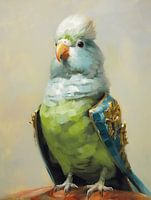 De parkiet die zich koning waande. Kleurrijk portret met een knipoog. Kies zelf het formaat en materiaal bij dit werk en maak het helemaal passend voor jouw interieur.