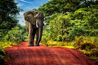 Zuid-Afrika voor een safari helemaal in beeld. Die ochtend waren we op zoek naar olifanten en het was deze enorme stier die we op onze weg vonden. Wij stopten onmiddellijk en toen wij merkten dat hij niet van plan was terug te krabbelen en zelfs zijn weg zou vervolgen, drongen wij niet aan en keerden om .... .