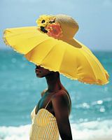 De perfecte stranddag, modern portret. Een vrouw met een grote gele hoed loopt op het strand. met dit werk haal je de zomer in huis!