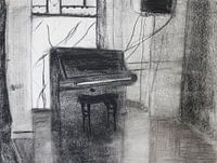 Interieur met piano in zwartwit. Mooi contrast tussen licht en donker. De foto is gemaakt in het Amsterdamse Huize Lydia.