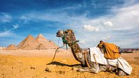 Kameel in de Egyptische woestijn met de piramides van Gizeh op de achtergrond