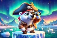 In de magische stilte van het poolgebied, waar het gefluister van de koude wind en de majestueuze stilte elkaar ontmoeten, staat een kleine ijsbeer verkleed als een dappere piraat. Zijn vacht is zo wit als de omringende sneeuw, zijn uitdrukking wordt gekenmerkt door kinderlijke nieuwsgierigheid en dorst naar avontuur. Met een gouden telescoop, een onmisbaar gereedschap voor elke schattenjager, tuurt hij over het glinsterende ijs. Zijn piratenhoed, versierd met een klassiek symbool van een schedel en gekruiste botten, benadrukt zijn spel met fantasie. Het noorderlicht danst aan de hemel en schildert oogverblindende kleuren aan het firmament, weerspiegeld in het ijzige oppervlak. Dit schilderij is een levendige weergave van dromen en verhalen en nodigt ons uit om het kind in ons te houden en de wereld met verwondering en ontzag te bekijken.