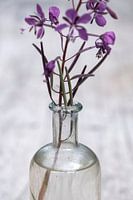 Op deze foto een takje paarse veldbloem, midden in de zomer in een antiek medicijnflesje.