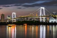 De Regenboogbrug in Tokio is een indrukwekkend bouwwerk dat het stadscentrum met het eiland Odaiba verbindt en 's avonds prachtig schittert. De elegant gebogen structuur en de sierlijke verlichting creëren een spectaculaire omgeving. Een adembenemend gezicht langs de skyline van Tokio bij een prachtige zonsondergang.
