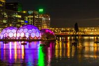Deze prachtige bollen in het water van Rotterdam zijn s'avonds prachtig verlicht. Dit is achter het nieuwe Luxor.