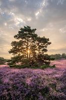Een schilderachtige sfeervolle landschapsfoto van Grove Dennen op de bloeiende heide tijdens een mooie zonsopkomst. Het mooie zachte warme goudenlicht van de opkomende zon schijnt fraai over de paars bloeiende heide. En geeft het werk een prachtige schilderachtige, serene en warme sfeer. In deze mooie foto zie je de stilte en schoonheid van de natuur met zijn prachtige kleuren. De prachtige wolkenlucht zorgt voor een fraaie dieptewerking in het kunstwerk. De prachtige paars bloeiende heide en het zachte goudenlicht van de opkomende zon maken het werk bijzonder warm en kleurrijk. Met deze prachtige foto als wanddecoratie haal je de stilte en schoonheid van de natuur in huis.