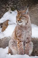 De prachtige lynx van de stad zit verticaal in de sneeuw en kijkt met grote heldere ogen naar anderen. lynx in de winter tegen de achtergrond van de rotsen.