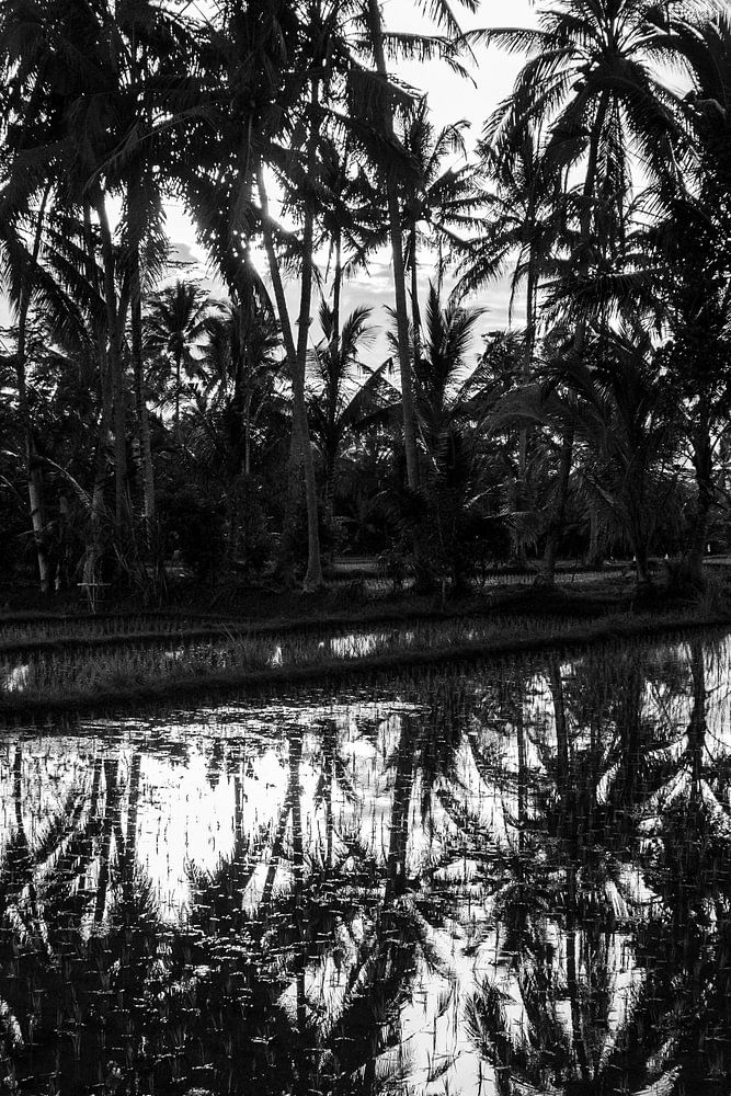 De prachtige palmbomen van Bali, Indonesië, in zwart-wit. De bomen staan aan de rand van de rijstvelden.