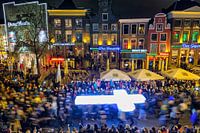 Deelnemers aan de processie van het Paas evenement The Passion dragen het 300 kilo zware wit verlichte kruis langs de horecagelegenheden aan de Noordzijde van de Grote Markt in Groningen, in de richting van de Vismarkt. De foto is gemaakt in het voorjaar van 2014.