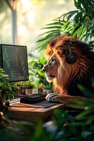 In een jungleachtig paradijs zit een majestueuze leeuw geconcentreerd achter een computer met een koptelefoon op. Omringd door weelderig groen en zacht licht lijkt hij diep in digitale werelden te willen duiken. De harmonieuze combinatie van natuur en technologie creëert een fascinerende sfeer waarin het ongewone overgaat in het leven…