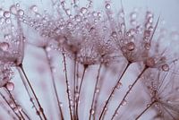 "De puisjes van een paardenbloem met druppeltjes" is een macrofoto van gekleurde druppeltjes op de pluisjes van een paardenbloem. Deze bewerkte foto heeft kleuren die ik zou omschrijven als oudroze / champagne kleur/blauw / grijs / tinten.