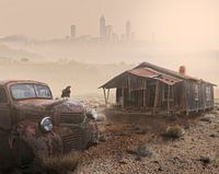De raaf in een soort van post apocalyptische scene. Het is een composite van vijf verschillende foto's. Alle gebruikte foto's zijn gemaakt door mijzelf. De raaf is van Fuerta Ventura, de voorgrond van Tenerife, de auto en het verlaten huis komen uit de VS en de stad op de achtergrond is San Gimignano in Italië.