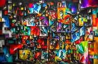 Een abstract schilderij, kleurrijk, vrolijk en modern.