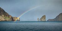 Tussen Tindhólmur en het eiland Vagar ligt de bijzonder rots Drangarnir. Terwijl we de rots naderden, scheen heel even de zon en onthulde zo een prachtige regenboog.