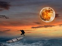 Surrealistische creatie van een raaf die een boot naar het strand leidt